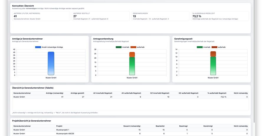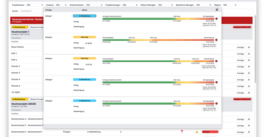 Die Anwendung ermöglicht Organisationen, Genehmigungsprozesse zentral zu dokumentieren, Fristen zu überwachen und zugehörige Dokumente systematisch zu verwalten. Eine integrierte Kartenansicht ermöglicht zudem die geografische Darstellung von Genehmigungsstandorten.